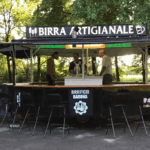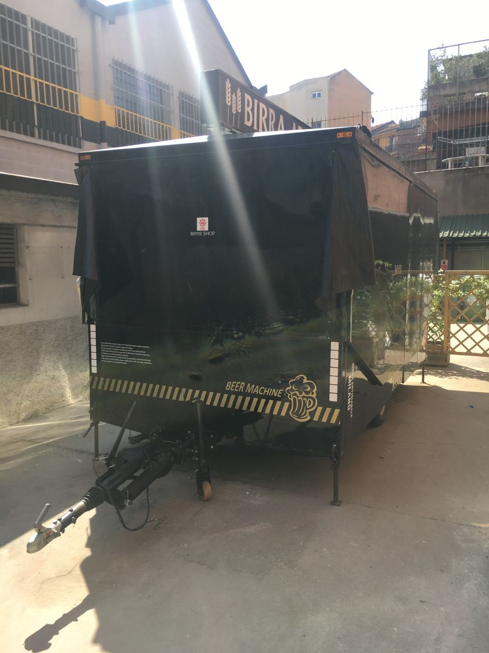 Il Birrificio Barona di Milano vende rimorchio Truck-food attrezzato con banco centrale inox piano di lavoro piatto di servizio birra, con lavaggio bicchieri e lavandino.