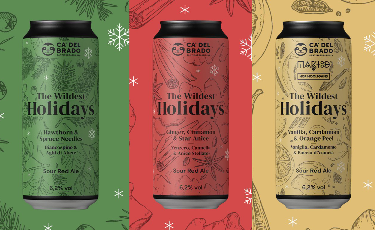 Il birrificio Ca’ del Brado (sito web) ha deciso di festeggiare il Natale 2025 con la bellezza di tre birre inedite, appartenenti alla linea The Wildest Can. Ognuna si caratterizza per un’aromatizzazione diversa, indicata nel nome: The Wildest Holydays – Biancospino e aghi di abete (6,2%), The Wildest Holidays – Vaniglia, cardamomo e scorza d’arancia (6,2%), The Wildest Holidays – Zenzero, cannella e anice stellato (6,2%). In tutti i casi la birra di partenza è una Red Ale acida, frutto di una fermentazione mista ottenuta lasciando maturare a lungo la birra nella cantina del birrificio. Inoltre nel grist è presente una percentuale di Grani Alti del territorio.