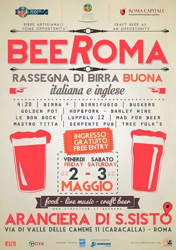 Nella cornice dell’Aranciera di San Sisto a Roma andrà in scena, venerdì 2 e sabato 3 maggio, la prima edizione di BeeRoma, rassegna dedicata alle birre italiane e inglesi. Ambasciatori di queste produzioni saranno 12 tra i migliori pub della Capitale: 4:20, Barley Wine, Birra+, Birrifugio, Buskers Pub, Golden Pot, Le Bon Bock, Luppolo 12, Mad for Beer, Mastro Titta, Serpente Pub, Tree Folk’s. Il programma prevede una tavola rotonda sulle opportunità economiche del settore (venerdì pomeriggio), musica dal vivo, area food. Ulteriori informazioni sulla pagina Facebook dell’evento.