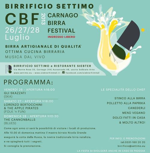 Non sono pochi i birrifici in festa in questo periodo e lo stesso vale anche per il Settimo (ex Siebter Himmel), protagonista da oggi fino a domenica 28 luglio del Carnago Beer Festival, chiaramente a Carnago (VA). Oltre alle birre della casa troverete cucina birraria, musica dal vivo, visite agli impianti di produzione, cotta pubblica della natalizia Rusca – sì, sembra fuori stagione, ma birre del genere vanno preparate con tanti mesi di anticipo. Se ne volete sapere di piĂą potete consultare la pagina Facebook dell’evento.