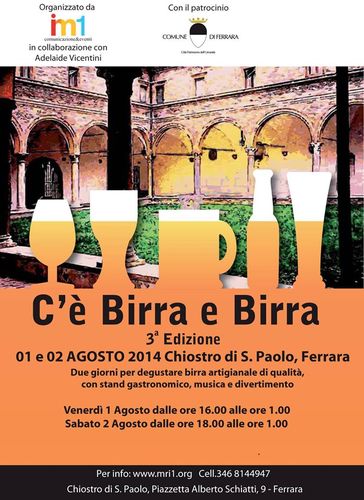 Si terrà venerdì 1 e sabato 2 agosto la manifestazione C’è Birra e Birra, che come nelle precedenti edizioni andrà in scena nel pittoresco Chiostro di San Paolo di Ferrara. I birrifici presenti saranno I Due Mastri, Argo, La Badia, Birra di Fiemme, Monkey, Trami e Nostrale. Il programma prevede stand gastronomico e musica dal vivo. Ulteriori informazioni sulla pagina Facebook dell’iniziativa.