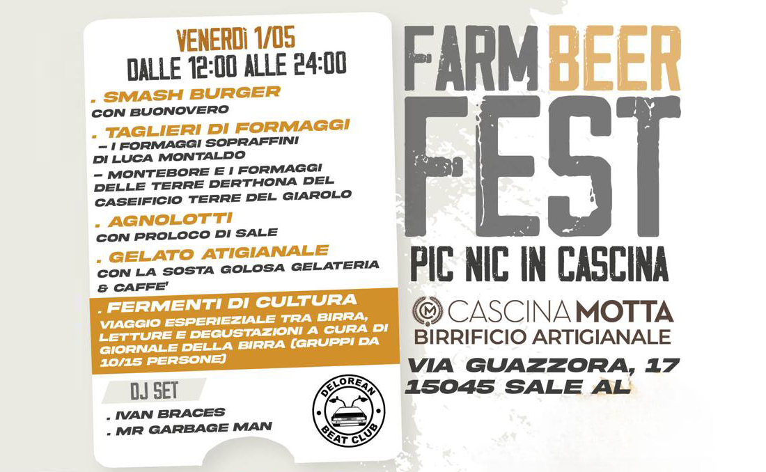 Si terrà giovedì 1 maggio l’evento Farm Beer Fest, ossia il picnic in cascina del birrificio Cascina Motta. Presso la sede di Sale, in provincia di Alessandria, si svolgerà una giornata di festa accompagnata dalle birre della casa e dagli altri contenuti: musica dal vivo, dj set, percorsi esperenziali e un’offerta gastronomica locale di primo livello, con smash burger, formaggi ricercati, agnolotti della tradizione, gelati artigianali. Il tutto ovviamente immerso nella campagna di Sale. Maggiori informazioni sono disponibili sul sito di Cascina Motta.