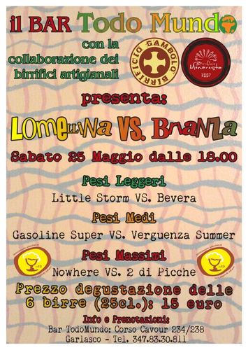 941557_149138451934298_119201826_nQuello delle degustazioni “a sfide” è un format che si sta diffondendo sempre di più in Italia e che ognuno reinventa di volta in volta secondo il suo gusto. In questa tipologia rientra l’evento di sabato 25 maggio al Todo Mundo di Garlasco (PV), in cui si scontreranno i birrifici Gambolò e Menaresta. La singolar tenzone si svolgerà attraverso tre testa a testa, in ognuno dei quali si scontreranno una birra per ogni produttore. L’incontro della categoria pesi leggeri vedrà scendere in campo Little Storm vs Bevera, quello dei pesi medi Gasoline Super vs Verguenza Summer, quello dei pesi massimi Nowhere vs 2 di Picche. Saranno presenti i rispettivi birrai, mentre il prezzo per la degustazione delle 6 birre (25 cl) è 15 euro.
