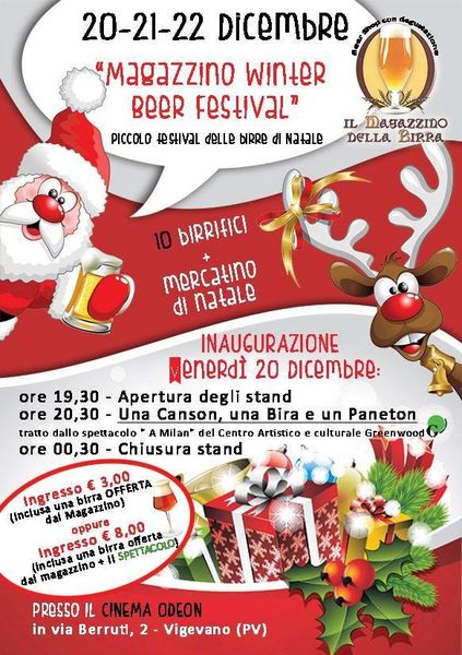 magazzino winterAnche quest’anno torna il festival invernale del Magazzino della Birra di Vigevano (PV), che si terrà da venerdì 20 a domenica 22 dicembre. Al Magazzino Winter Beer Festival saranno presenti 10 birrifici italiani: Baladin, Kamun, Geco, Jeb, Retorto, L’Incosueto, Aleghe, Acelum, Stradaregina e I Due Mastri. Il programma prevede la presenza di un mercatino di Natale, spettacoli dal vivo, musica live, laboratori per bambini e una ricca gastronomia. Per tutti i dettagli vi rimando alla pagina Facebook dell’evento.