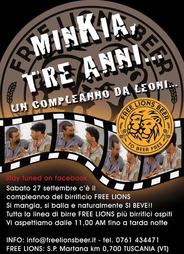 3 anni free lionsIl birrificio Free Lions festeggia 3 anni e per l’occasione organizza un evento celebrativo, battezzato Minkia… 3 anni. L’appuntamento è per domani sabato 27 settembre presso la sede produttiva di Tuscania (VT), quando saranno disponibili 12 spine che oltre alle birre della casa ospiteranno produzioni ospiti da birrifici amici (Buskers, Birra del Borgo, Eremo, Opperbacco e PBC). “Come digestivo o colpo di grazia” (cit) ci saranno i distillati De Marco. Formula classica a gettoni (2,5 € per 30 cl). Vi conviene portarvi un autista di scorta 🙂 .