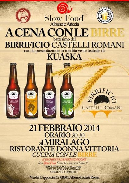 Tra le beer firm recentemente nate nel Lazio si segnala il Birrificio Castelli Romani, quantomeno per essere la creatura di Paolo Mazzola, ben conosciuto dagli appassionati di più vecchia data. Dopo un periodo di rodaggio, ora l’azienda è pronta a presentarsi ufficialmente con una cena di degustazione condotta da Kuaska, che si terrà venerdì 21 febbraio al ristorante Donna Vittoria di Albano Laziale (RM). Chiaramente protagoniste saranno le produzioni del Birrificio Castelli Romani: Diana di Nemi abbinata a insalata d’orzo, aringa affumicata, finocchio e ravanelli; L’Ariccina abbinata a tortiglioni con specj dop tirolese e crema di birra Ariccina agli scalogni; Pig Floyd abbinata a pollo al miele ed erbe robuste; Giulio Agricola abbinata a Birramisù. Per ulteriori informazioni vi rimando alla pagina Facebook dell’evento.