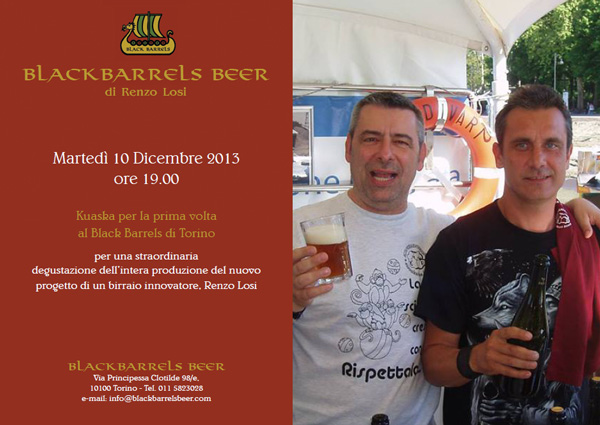 black-barrelsUn anno fa partiva la nuova avventura di Renzo Losi, dopo la non facile dipartita dal Birrificio Torrechiara. A Torino diede vita al suo Black Barrels, progetto dalla natura quantomai originale: un po’ beershop (al piano superiore), un po’ birrificio/cantina di affinamento (al piano interrato). Per celebrare il primo compleanno, martedì 10 dicembre si terrĂ  la festa di anniversario, condotta da Kuaska. SarĂ  proposta in degustazione l’intera gamma: Lemon Kolsch, Kriek dei puffi, Seconda Luna, Nut-the Irish Jinn, Vedova nera, Red Poison e Oca Elettrica.
