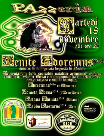 Se le vetrine dei negozi sono già addobbate a festa, perché non cominciare anche con le iniziative birrarie a sfondo natalizio. Ecco che allora martedì 18 novembre la Pazzeria di Milano terrà la sua tradizionale degustazione a tema, battezzata Venite Adoremus. I protagonisti della serata saranno i birrifici Il Chiostro, Orso Verde, Geco e Birrificio Milano, mentre la conduzione sarà affidata a Nicola “Nix” Grande, birraio del Birrificio Settimo. Sarà possibile anche assaggiare l’edizione 2014 della Befana Chinata, apprezzata birra natalizia creata in collaborazione con i Malti da Legare. Per prenotazioni e ulteriori informazioni vi rimando alla pagina Facebook dell’evento.