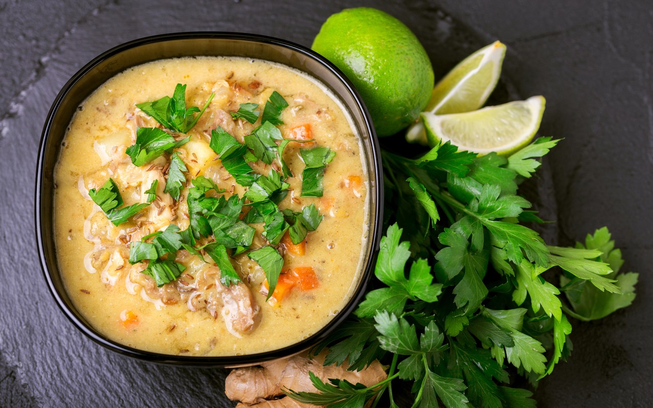 Una delle pochissime zuppe della cucina indiana, il cui nome significa letteralmente “acqua al pepe”, acquisita e accomodata dai colonizzatori inglesi (del XVIII secolo) e poi assorbita nei ricettari della Terra di Albione. Piatto di conforto semplice da realizzare, la Mulligatawny ha una base da brodo vegetale classico cui si aggiungono una minuscola grammatura di burro, latte di cocco, riso basmati, un ampio ventaglio di spezie – semi di coriandolo e di cumino, pepe nero in grani, curcuma, zenzero, aglio, cannella, chiodo di garofano, alloro indiano, menta e (una quantità omeopatica di) curry – e infine dei piccoli ritagli di carne di pollo (o di montone).