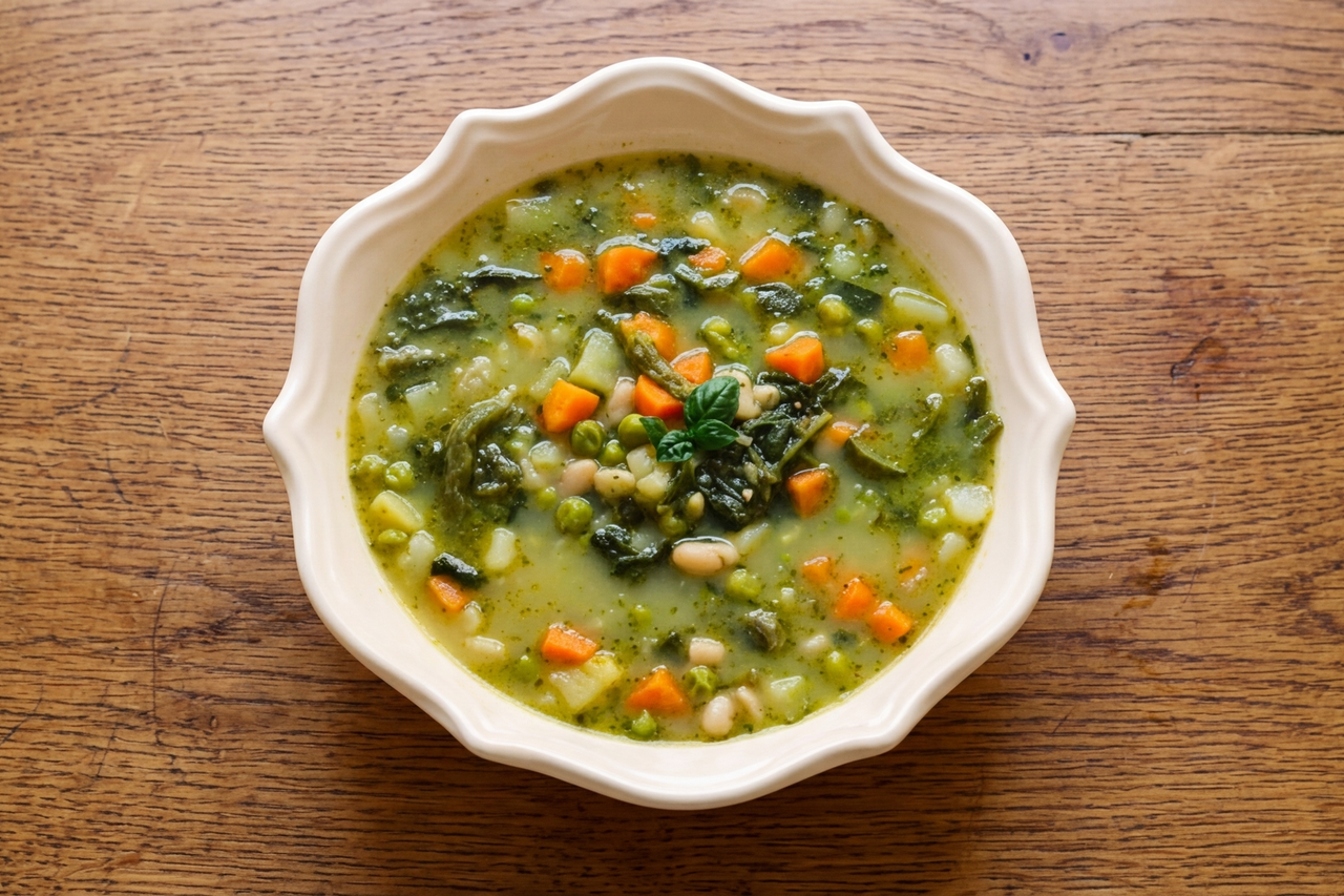 In una regione dove fare agricoltura significa realmente essere degli eroi, ecco una ricetta che racconta della nobiltà delle verdure e della capacità di un ingrediente semplice e geniale come il pesto di dare una “spinta” che rende l’insieme davvero speciale. Il minestrone alla genovese è un piatto realizzabile tutto l’anno, cambiando le verdure in coerenza con la stagione, ma qui scriviamo della versione primaverile, che annovera tra gli ingredienti: patate, carote, cipolle bianche, fagiolini, zucchine novelle con il fiore, fagioli borlotti, bietole, piselli. A questa base si aggiunge il “vero” pesto classico – preparato con basilico genovese, parmigiano, pecorino, pinoli, olio EVO e il peculiare aglio di Vessalico Presidio Slow Food; per dare il meglio deve essere aggiunto al minestrone quando è tiepido, fuori dal fuoco. Infine la pasta, rappresentata di solito dai rimasugli della lavorazione dei tagliolini o delle tagliatelle.