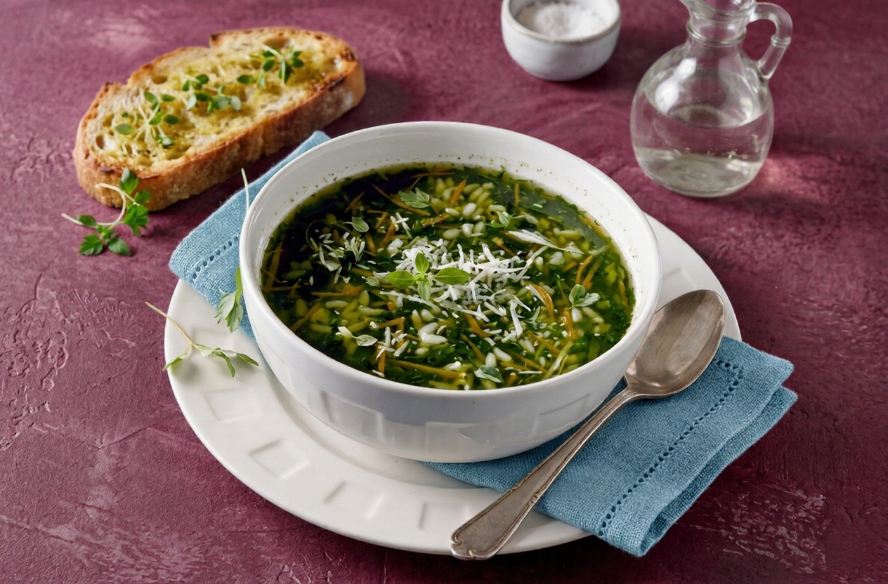 Piatto tipico dell’andriese e del pranzo di Santo Stefano, è oggi presente sulle tavole di tutta la Puglia durante tutta la stagione fredda. La minestra verde si caratterizza per un brodo fatto con un gran numero di verdure di stagione – cardi, finocchi, cavolfiore, cicoria, verza, scarola, bietolina (o spinaci), sedano, prezzemolo, cipolla, carota – che vengono integrati in un fastoso brodo di carne misto, fatto con manzo, maiale, vitello, pollo e tacchino. Una volta pronta la minestra, si aggiunge la pasta, di solito piccoli ritagli della pasta all’uovo, oppure pezzi di pane raffermo. A guarnire, dopo l’impiattamento, vanno il pepe, un giro d’olio e del pecorino pugliese (o parmigiano) grattugiato.