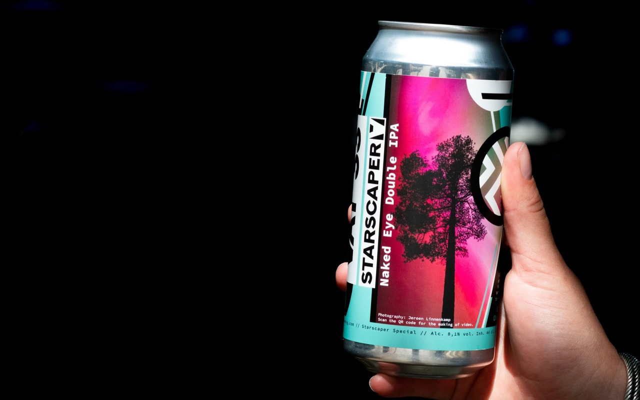 Poi ci sono i formati da 50cl, che cambiano completamente tono: il nero sparisce, sostituito da un azzurro turchese che fa da sfondo a fotografie di paesaggi notturni, rigorosamente neerlandesi. Ogni lattina è accompagnata da un QR code che permette di scoprire il backstage dello scatto. L’idea è bellissima, ma forse l’identità visiva nel complesso rischia di disperdersi un po’ tra i due approcci. Tuttavia, non si può negare che Vat33 riesca a farsi notare e a proporre un racconto visivo non banale, in cui il territorio resta comunque un punto fermo.
