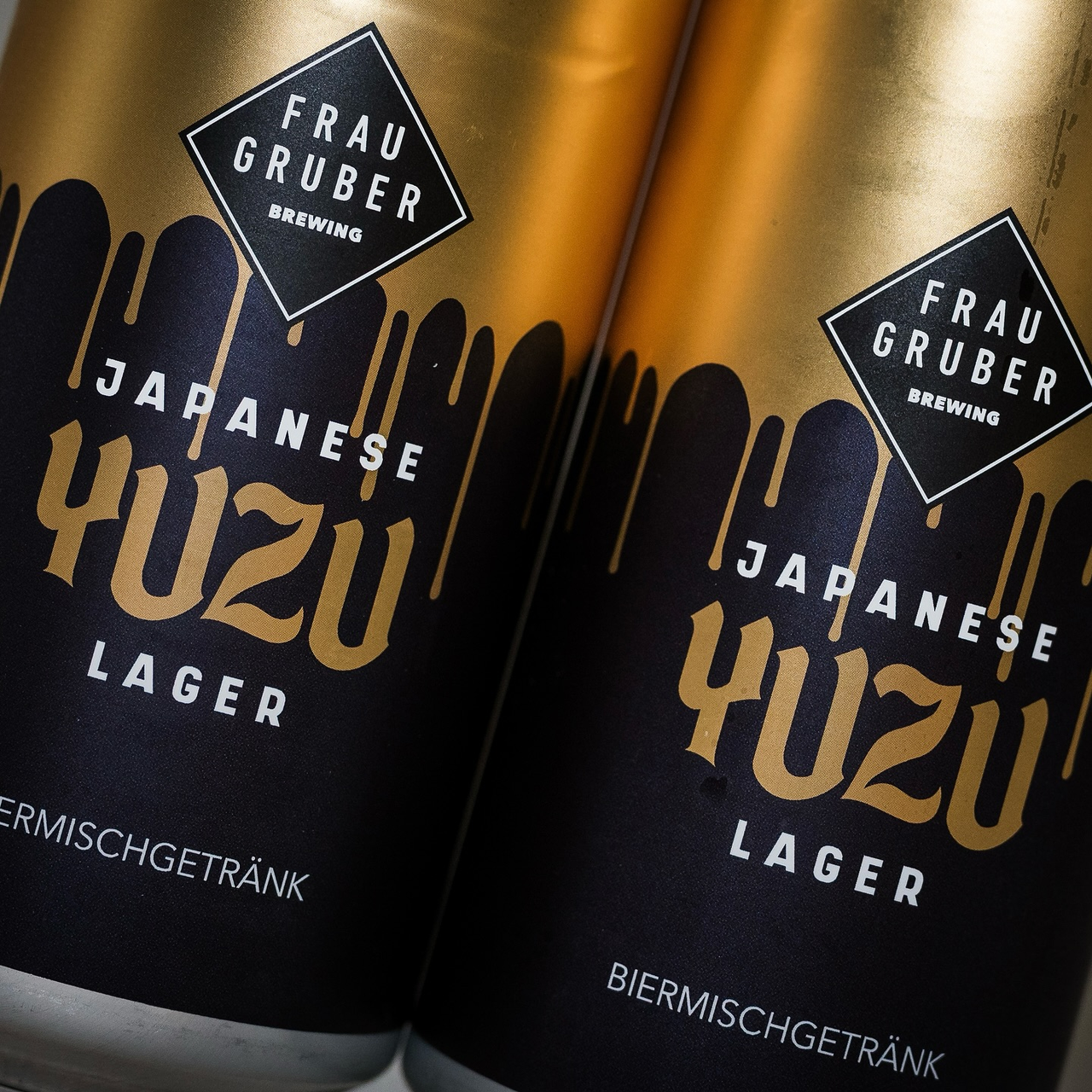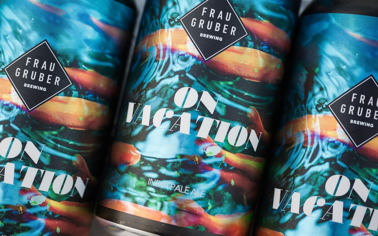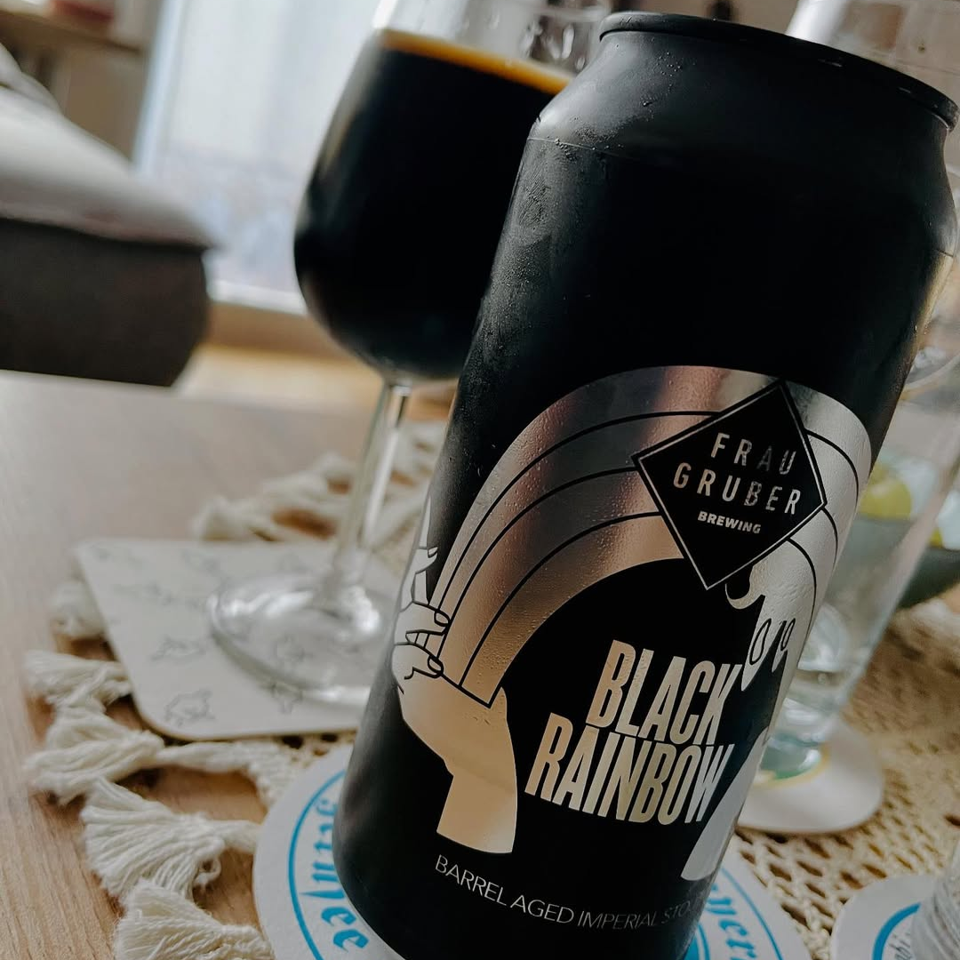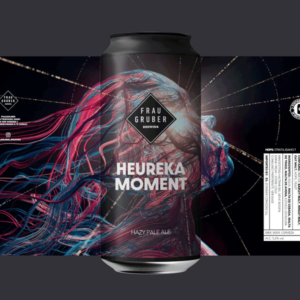 Chiudiamo con Frau Gruber (sito web), birrificio nato nel 2016 ad Augsburg dall’incontro tra due homebrewer, Axel e Enzo, che in pochi anni hanno costruito uno dei brand più riconoscibili della scena craft tedesca. Frau Gruber lavora su un doppio binario: logo e struttura grafica minimale, ma ampio margine di espressività sulle etichette. La base nera – sia nella lattina che nello sfondo del logo – diventa una cornice che unisce tutte le referenze, qualunque sia l’illustrazione protagonista. Alcune serie sono più artistiche, altre più decorative, ma tutto resta riconducibile a un’estetica comune e molto ben calibrata.