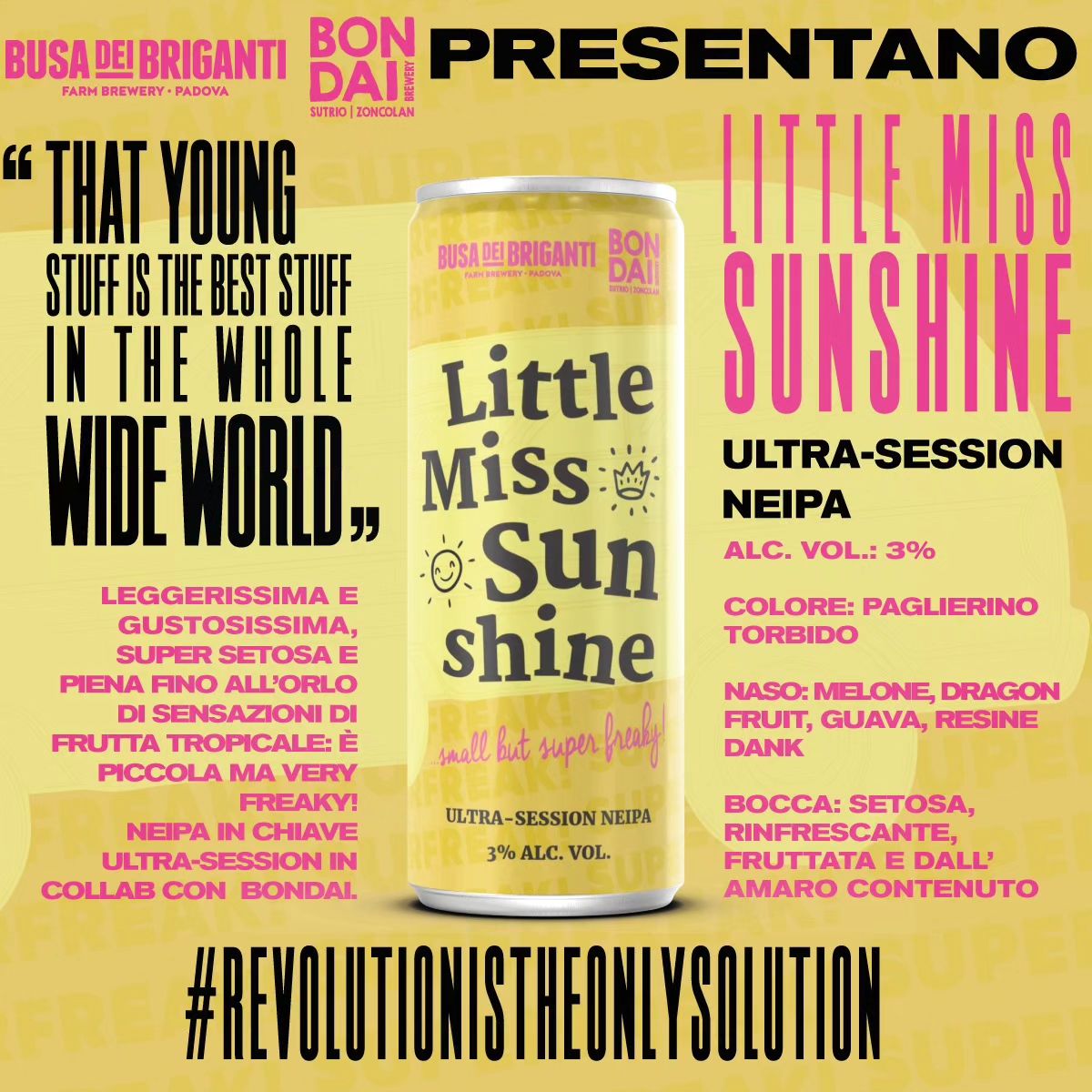 E concludiamo restando sul genere delle Hazy IPA per segnalare la Little Miss Sunshine (3%), nata dalla collaborazione tra i birrifici veneti Busa dei Briganti (sito web) e Bondai (sito web). È definita una Ultra-Session NEIPA e in effetti il tenore alcolico è davvero contenuto: una sfida produttiva molto stimolante, anche solo per riuscire a mantenere il corpo setoso tipico della tipologia. Di aspetto torbido, si caratterizza per una corsa vellutata e un amaro molto leggero, nonché per un profilo aromatico intensamente fruttato, con sfumature di melone, guava, dragon fruit e resina di pino. Perfetta per continuare a dissetarsi anche in questo caldo settembre.