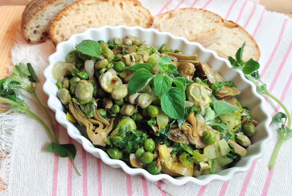 La vignarola, come accenna il nome, era il tipico pranzo primaverile dei vignaioli (del Lazio). La ricetta è molto articolata e prevede: piselli e fave freschi, lattuga, cipollotti, carciofi, limone, extravergine di oliva e menta romana, coadiuvati da un brodo vegetale fatto con gli scarti di queste verdure. Nutriente, fresca e invitante, può essere mangiata come una grande insalata “rinforzata” dal pane oppure come condimento per paste o risi. La ricetta tradizionale prevede anche il guanciale, ma oggi è di frequente servita senza.